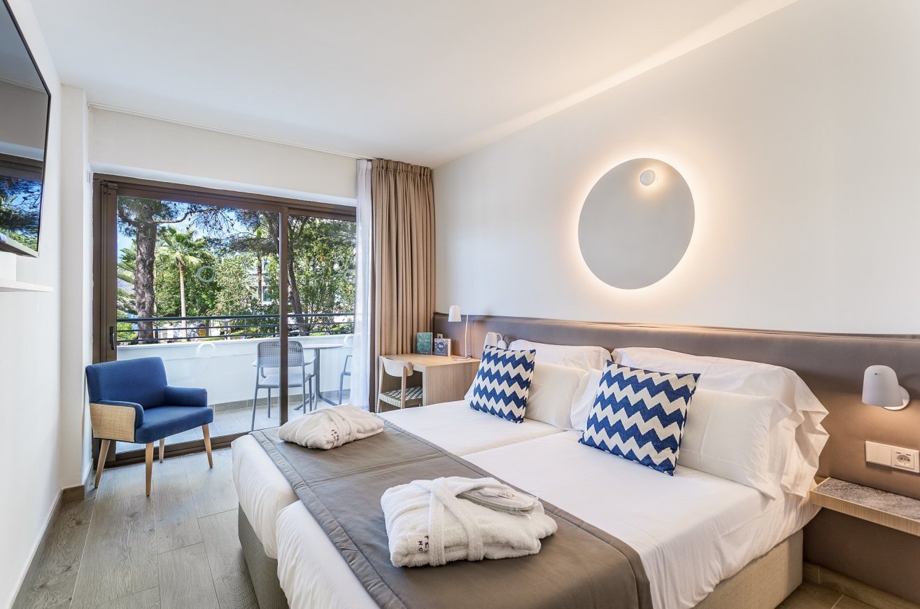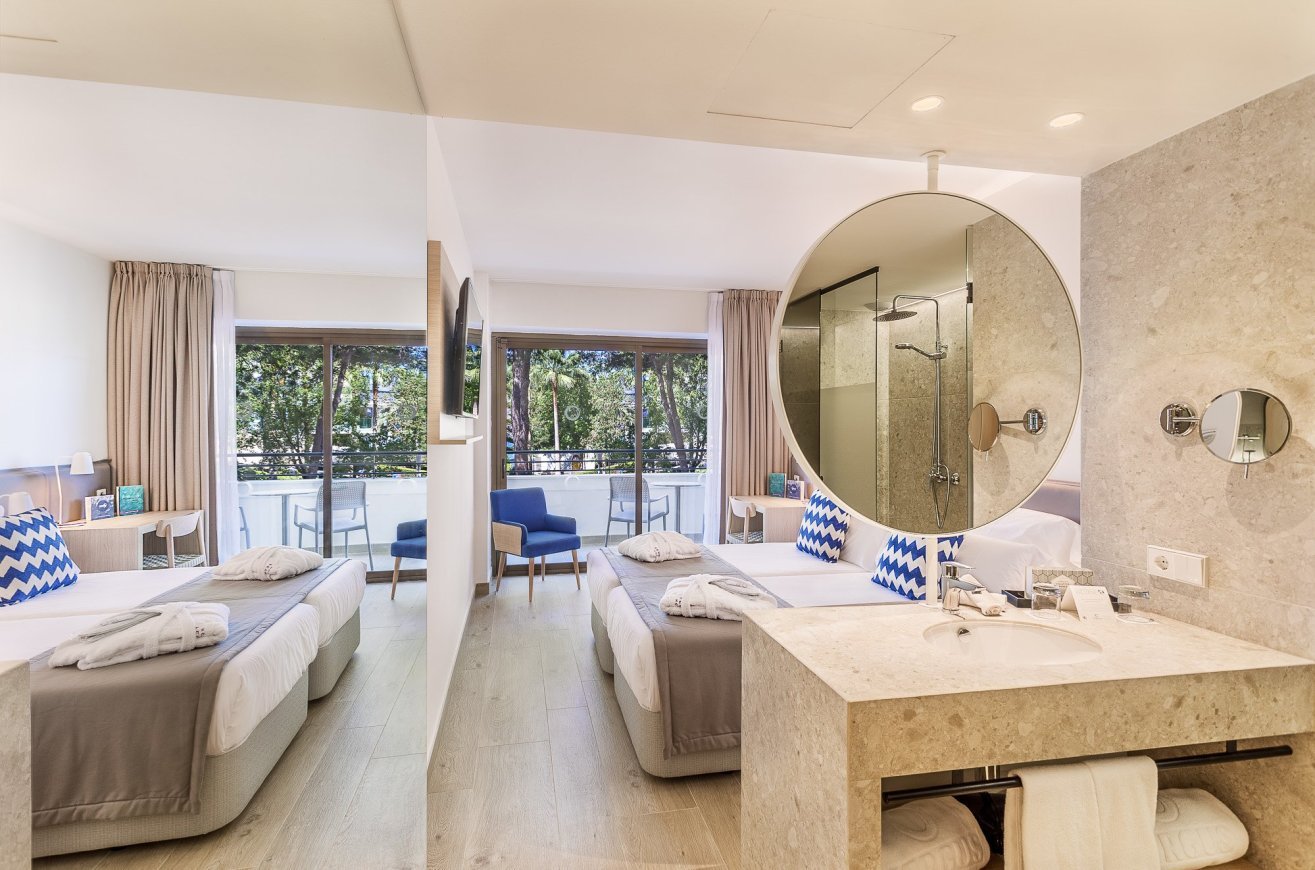 Kétágyas szoba: kb. 21 m². A szoba rendelkezik gardróbbal, teljes fürdőszobával, hajszárítóval, WiFi-vel, Nespresso kávégéppel és hozzá tartozó kapszulával, széffel, papuccsal, telefonnal, TV-vel, köntössel, terasszal, légkondicionálóval, illetve minibárral (további költség).